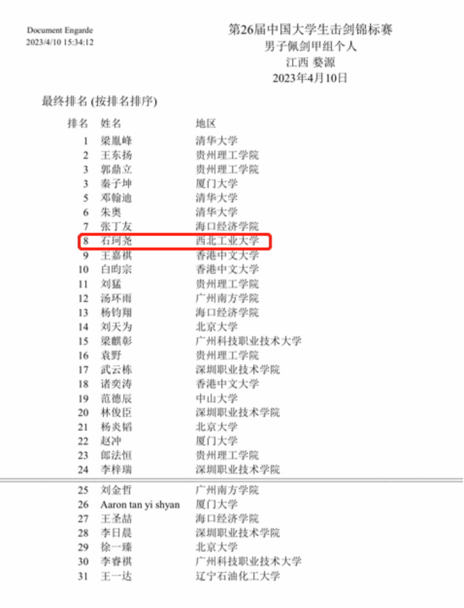 此次比赛共有51所高校650余名运动员参加,是历届比赛中规模最大、水平最高的一次比赛。PP电子游戏网站的石珂尧同学代表学校参加了男子佩剑甲组的比赛,最终取得了学校男子佩剑历史最好成绩,全国赛第八名!