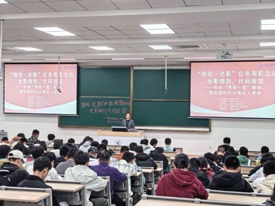 2025级本科组织“铸剑・光影”红色观影活动,学生们在教学西楼D201教室集中观看影片《横空出世》。观影前,辅导员韩淑捷老师介绍了PP电子游戏网站与国家重大科技工程的深厚渊源及“为国铸剑”的校史传统。结束后,两名新生代表结合专业发言,表达了传承“两弹一星”精神、激扬“代码报国”志向的坚定决心。