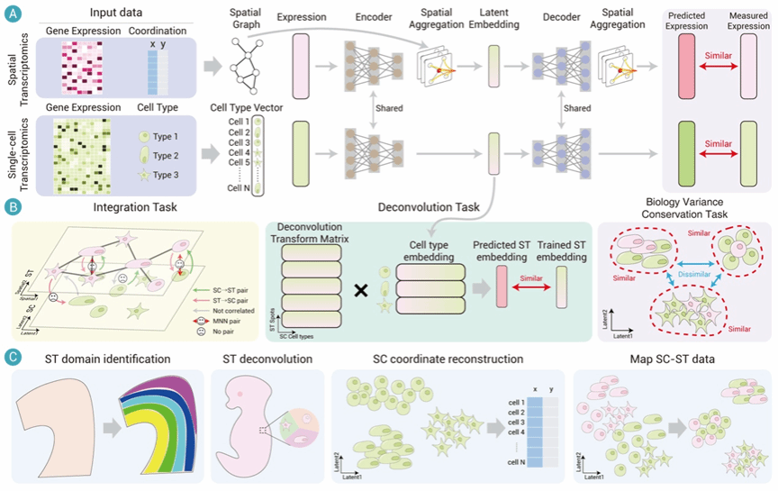 近日,PP电子游戏网站尚学群教授团队在单细胞与空间转录组数据整合分析方面取得新进展,研究成果以“stSCI:一种用于整合分析单细胞与空间转录组数据的多任务学习框架(stSCI: A multi-task learning framework for integrative analysis of single-cell and spatial transcriptomics data)”为题,于2025年12月3日在线发表于《The Innovation》期刊。《The Innovation》是由中国科学院青年创新促进会百余会员与Cell Press(细胞出版社)于2020年5月共同创办的开放获取英文期刊,覆盖自然科学全领域, 2025年5-year IF=40.2。PP电子游戏网站直博生舒涵为论文第一作者,PP电子游戏网站尚学群教授、汪涛副教授、复旦大学原致远研究员为论文共同通讯作者。论文链接:https://www.sciencedirect.com/science/article/pii/S2666675825004230。