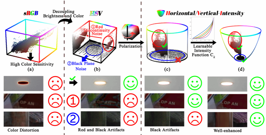 “传统色彩空间像把固定钥匙,而我们要打造万能锁匠。”冯宜湑指着图1中的HVI模型解释道。在低光环境,如夜景、地下空间中拍摄的图像常面临亮度不足、颜色失真和噪声严重等问题。传统方法基于sRGB/HSV色彩空间,在提升亮度的同时难以有效保留图像细节,易产生“伪影”和“色偏”现象。对此,冯宜湑提出了可训练的色彩空间,让色彩“活”起来,通过引入极坐标化HS映射和可学习的强度映射函数,成功解决了低光图像中低信噪比的问题,实现了色彩与亮度的精确解耦(如图1)。