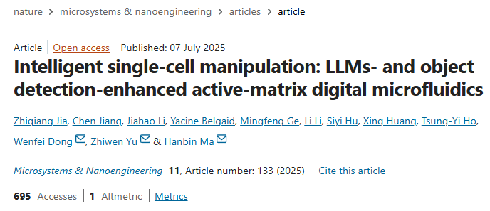 近日,人机物融合智能计算团队最新研究成果“Intelligent single-cell manipulation: LLMs- and object detection-enhanced active-matrix digital microfluidics”被Nature子刊《Microsystems and Nanoengineering》录用并在线发表。PP电子游戏网站人机物融合智能计算创新中心(於志文教授,黄兴教授)、中心共建企业广东奥素液芯微纳科技有限公司(马汉彬研究员)、中国科学院苏州医工所、长春理工大学、香港中文大学等单位共同完成,於志文教授为该论文的共同通讯作者。
