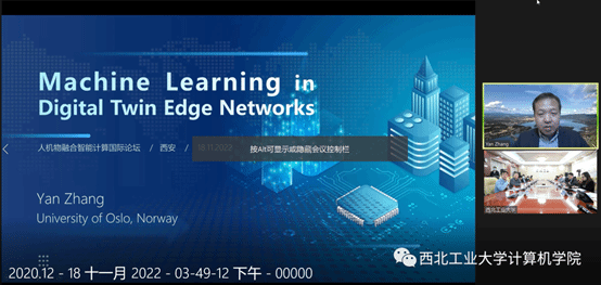 论坛第一部分由IEEE Fellow、欧洲科学院院士Yan Zhang教授发表了以《Machine Learning in Digital Twin Edge Networks》为主题的主旨报告。Zhang教授认为,数字孪生作为一种有效的信息表示技术,能够有力支持国家数字化发展战略,在产业界和学术界得到同步快速发展。他从多个角度对数字孪生技术进行了剖析,并从数字孪生边缘网络的实现出发,详细阐述了数字孪生边缘网络的构建与应用的相关问题,开拓了师生的研究视野。报告结束后,与会师生踊跃发言,积极提问。Zhang教授与师生进行了热烈讨论,就数字孪生、区块链等方面的提问作出详细解答,介绍了相关研究焦点问题的最新风向。